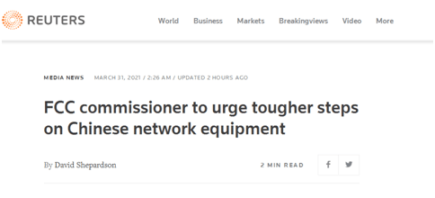 据路透社消息,美国联邦通信委员会(FCC)共和党委员布伦丹∙卡尔当地时间3月30日呼吁该机构采取新措施,宣称要确保禁止华为技术和中兴设备进入美国电信网络,以及确保没有由所谓“强迫劳动”生产的电子设备进入美国。