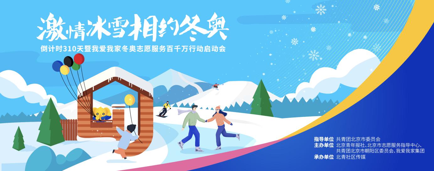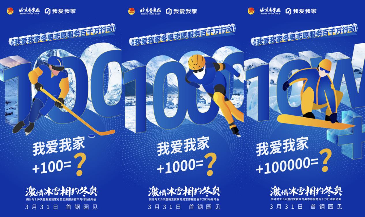 3月31日,在共青团北京市委员会、北京市志愿服务指导中心、共青团北京市朝阳区委员会的指导下,我爱我家集团将联合北京青年报社、北青社区传媒,在北京冬奥组委驻地首钢园召开“激情冰雪 相约冬奥 倒计时310天暨我爱我家冬奥志愿服务百千万行动启动会”。届时,共青团北京市委员会、北京青年报社、共青团北京市朝阳区委员会、我爱我家集团等单位领导将出席本次活动。共同向广大市民和冰雪爱好者发出倡议,让奥运精神融入社区、进入百姓生活,引导全民参与健身运动,努力实现“带动三亿人参与冰雪运动”的目标。