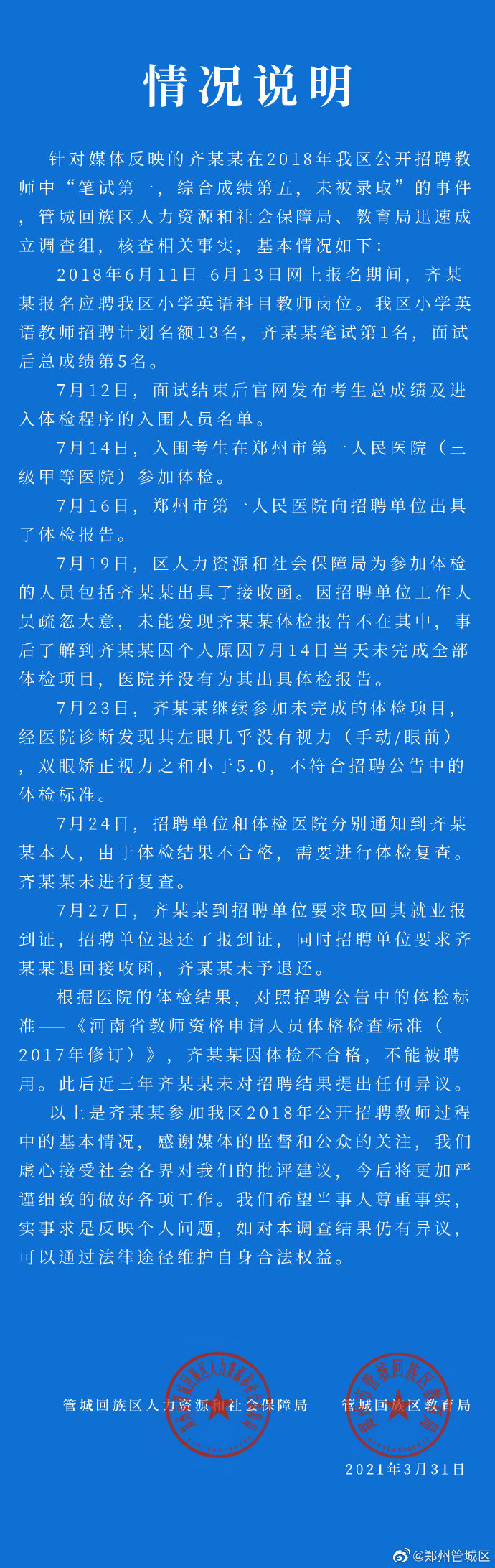 @郑州管城区 微博3月31日凌晨发布《关于齐某某在2018年管城区公开招聘教师中“笔试第一,综合成绩第五,未被录取”事件的情况说明 》。《说明》称,齐某某体检结果不合格,需要进行复查,但其并未复查。