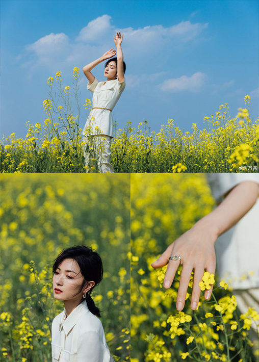 万茜在油菜花田晒出的九宫格中也是超级美的,感觉承包了整个花田。拍这种照片可以让镜头下移仰拍人物,或者像万茜一样蹲在地上,油菜花当前景,让画面干净,显得花充满屏幕。