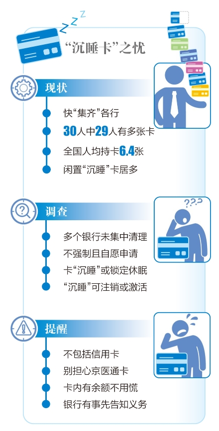 记者随机调查了30位市民,其中有29人持卡2张以上,人均拥有各类银行卡约5张。多家银行网点回应,目前并未有集中式清理“沉睡卡”的行动,但也会对长期不活跃的银行卡设置“锁定”或“睡眠”。如果储户确有需要,可激活继续使用。专家提醒,银行处理“沉睡卡”要遵守现有监管的要求,尽可能为客户提供便利,保护其合法权益。