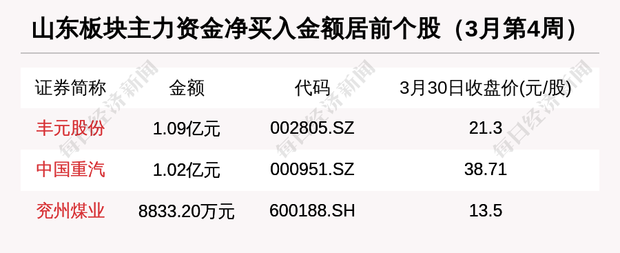主力资金方面,3月第4周,丰元股份(002805,SZ)净买入额居首位,为1.09亿元,其次是中国重汽(000951,SZ)(1.02亿元)和兖州煤业(600188,SH)(8833.20万元)。
