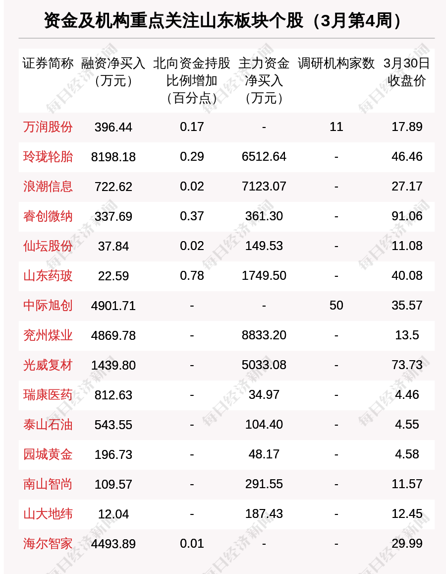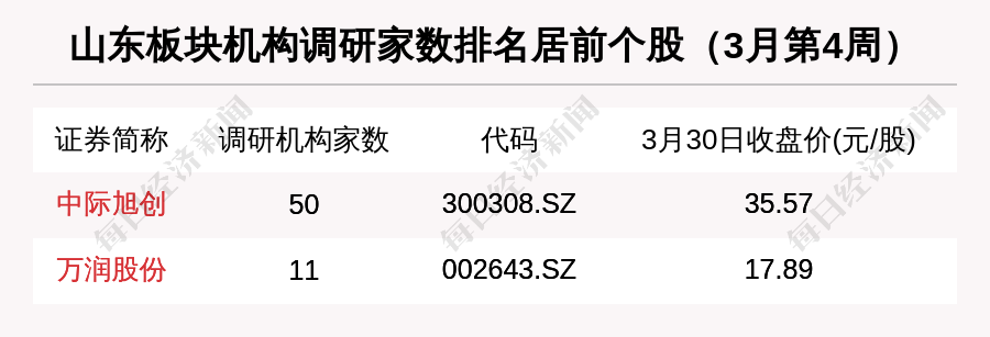 机构调研方面,3月第4周,有2家山东上市公司接受机构调研。其中,50家机构到访中际旭创(300308,SZ),11家机构到访万润股份(002643,SZ)。被50家机构调研的中际旭创,也被融资资金看好。