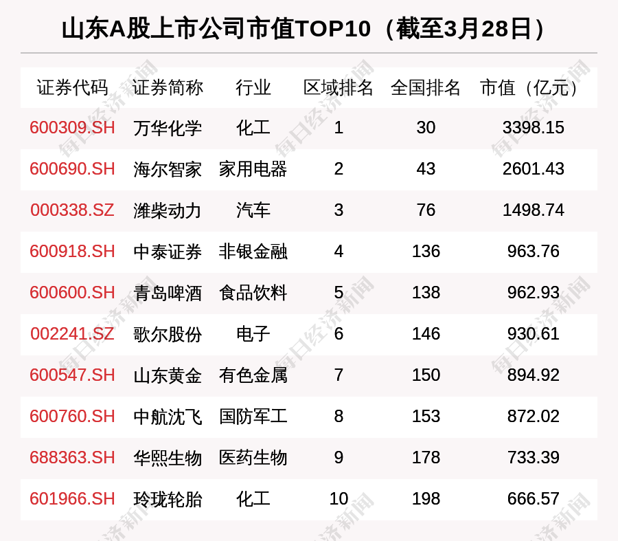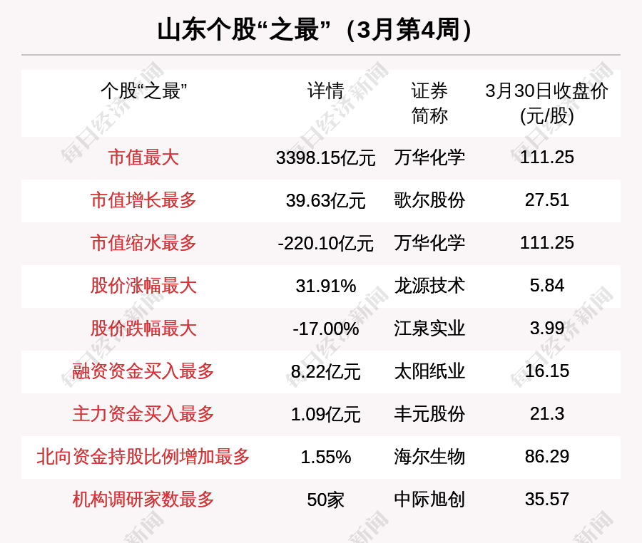 《每日经济新闻》记者注意到,截至3月26日收盘,山东板块市值最大的是万华化学,市值3398.15亿元。值得注意的是,在3月第3周,万华化学市值为3618.24亿元,但在上周跌去220.10亿元,成为山东231家A股公司缩水最多的企业。