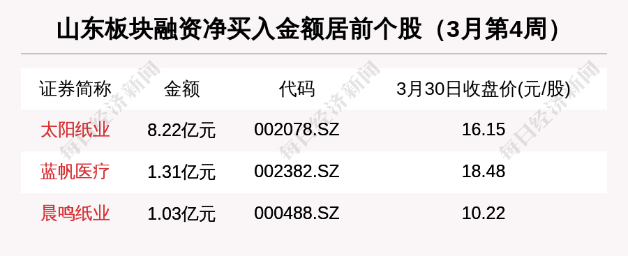 从融资资金方面看,3月第4周,山东板块融资净买入总额为11.14亿元。融资净买入最多的山东股是太阳纸业(002078,SZ),金额是8.22亿元,其次是蓝帆医疗(002382,SZ)和晨鸣纸业(000488,SZ)。