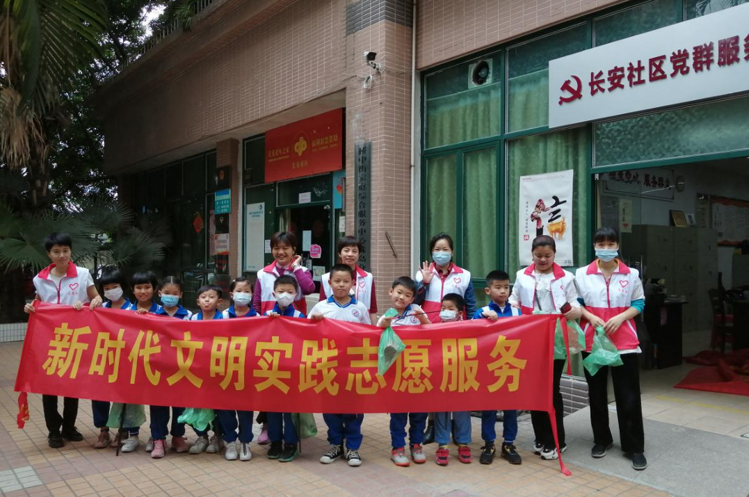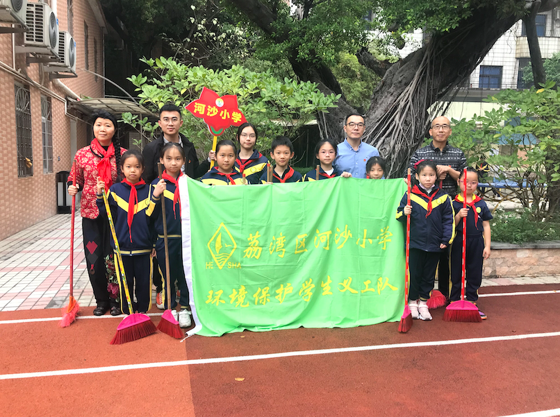 工作人员带领河沙小学学生开展社区打扫。