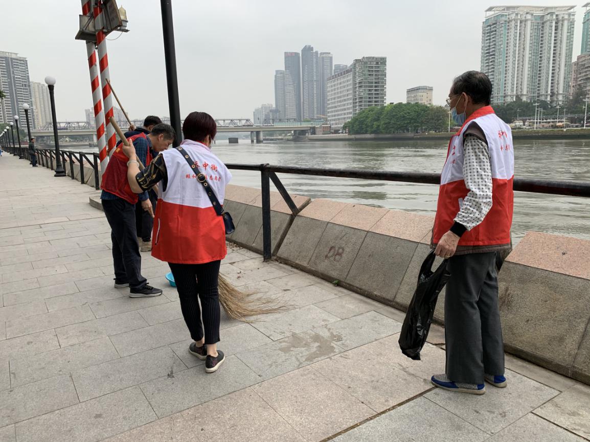 退役军人志愿者正在对沿江进行卫生清