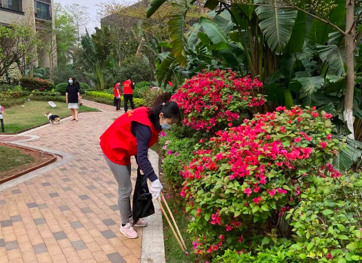 志愿者打扫社区绿化带