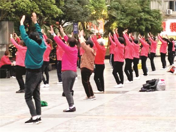“你是我的玫瑰,你是我的花……”伴随着优美动感的旋律,四五十位中老年人队列整齐,和着节拍认真舞动身姿。距此20多米开外,另一“方块队”也沉醉在健身操节奏里,两队人员互不相扰、怡然自乐。