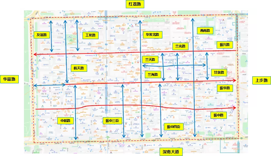 上步路、深南大道、华富路、红荔路围合范围内所有道路(不含4条边界道路)。