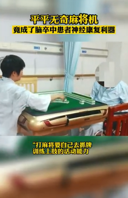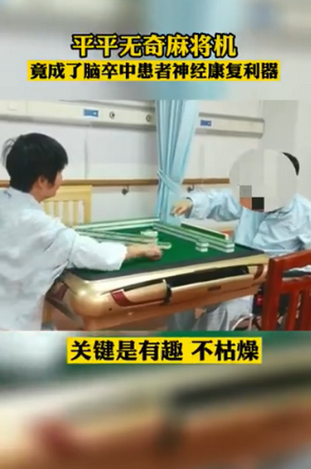 近期,广东东莞市康复医院住院部新到了一台康复训练“利器”——自动麻将机。该院神经康复科医护人员认为,它对脑卒中(中风)患者的康复能带来不小的帮助。“打麻将抓牌得动手,可锻炼上肢;要动脑,锻炼记忆力和认知能力;还要说话,锻炼言语能力。关键是有趣,不枯燥。”现在该科室住院的50多个病人中,有20多人都报名想打麻将。医护人员在每天晚上会安排几个患者轮流打一会儿,时间不会太长。