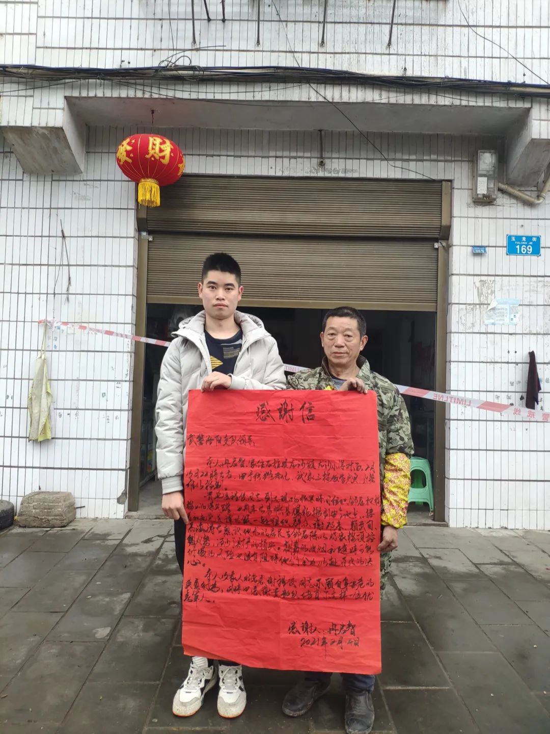 △失火房屋主人(右)给程俊(左)送来感谢信