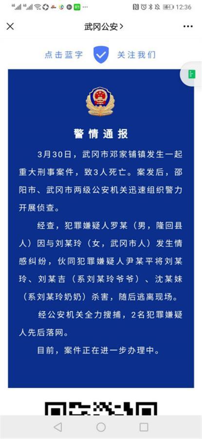4月1日凌晨,武冈市公安局发布警情通报称,3月30日,武冈市邓家铺镇发生一起重大刑事案件,致3人死亡。案发后,邵阳市、武冈市两级公安机关迅速组织警力开展侦查。
