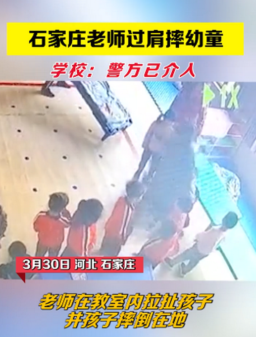 3月30日,河北石家庄,一段监控显示一名老师在教室内拉扯孩子,并将孩子摔倒在地。3月31日晚,@石家庄长安发布 通报:该学校为恒大御景半岛领德培训学校,30日中午幼儿园大班教师李某对中二班一幼儿存在过激行为。经教育部门核查,该校不具备办学资质。相关部门责令该校停止办学。目前,公安机关正在调查,并将依法严肃处理。