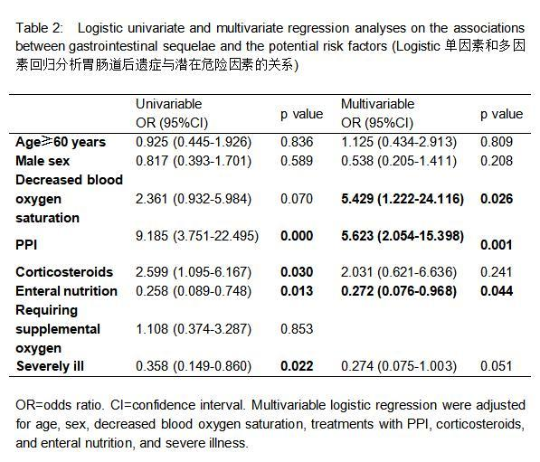 对于每个具体的胃肠后遗症,研究发现血氧饱和度下降会导致出院后厌食的发生率上升,而男性患者的厌食发生率比女性患者更低,但男性患者腹泻的发生率更高。