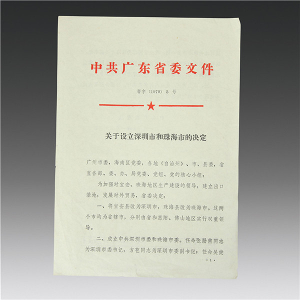 1979年,中共广东省委《关于设立深圳市和珠海市的决定》。深圳博物馆供图