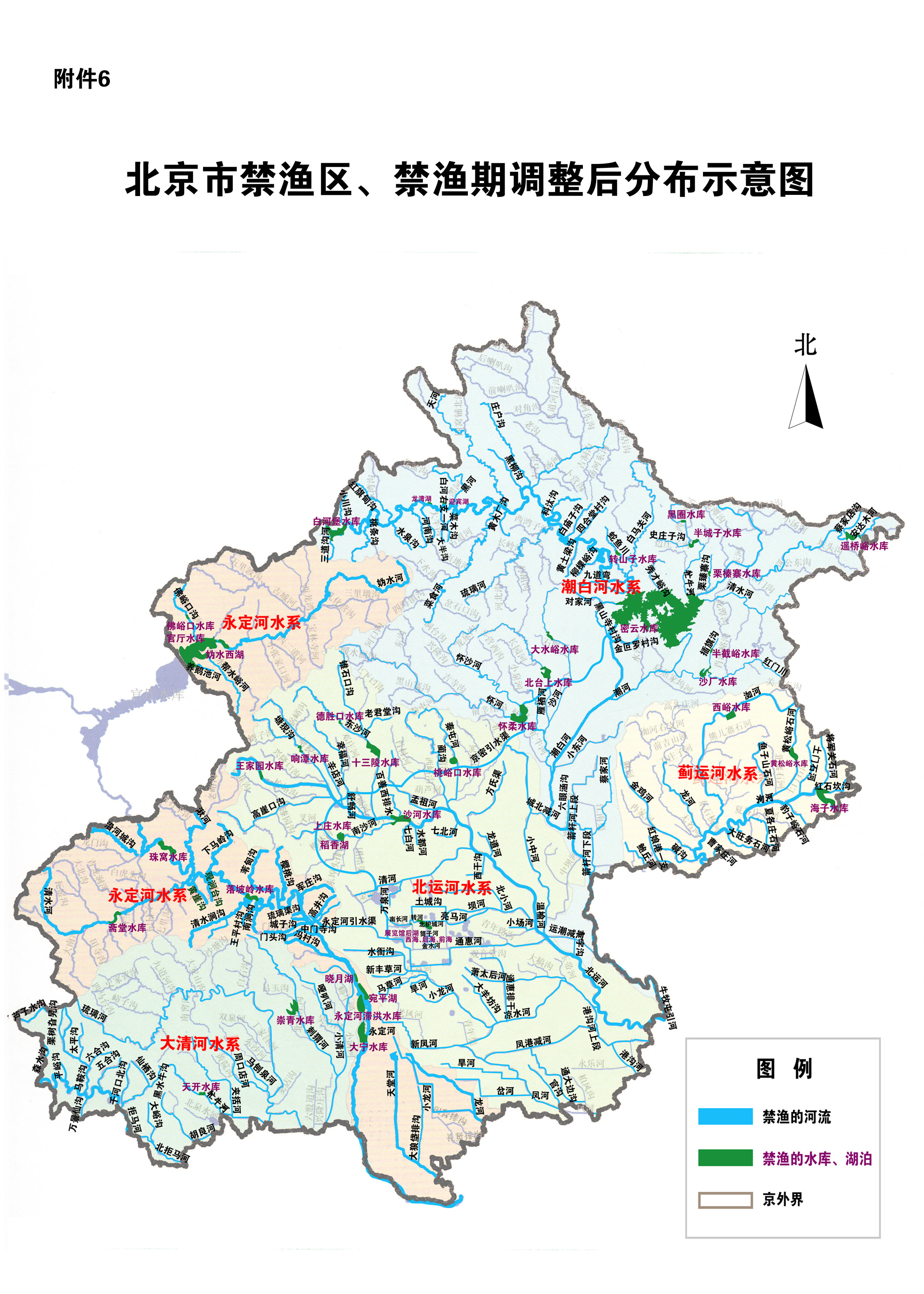 2019年,北京市重新调整了禁渔制度,禁渔范围涉及179条河流和41处水库、湖泊。其中,北运河、大清河、蓟运河等179条河流全年禁渔;密云水库、怀柔水库、海子水库等40处水库、湖泊4月1日0时至9月24日24时禁渔;官厅水库4月1日至8月15日禁渔。