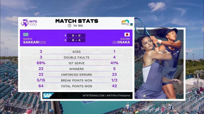 在萨卡里和大坂直美的比赛中,萨卡里首盘仅丢8分,第2盘1:4之后连赢5局,最终6:0 、6:4战胜对手。本场失利,使得大坂直美的23连胜遭到终结,重返世界第一的脚步暂时停止。