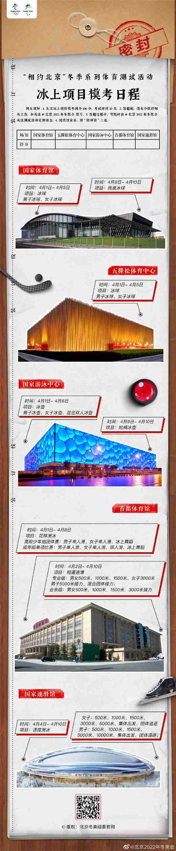 “相约北京”冬季系列体育测试活动冰上项目“模拟考”即将在4月1日-10日进行,包括了冰球,冰壶,短道速滑,花样滑冰,速度滑冰,残奥冰球,轮椅冰壶七个项目。下面我们开始划重点啦!一图在手,看啥都懂。考试不愁,逢考必过。