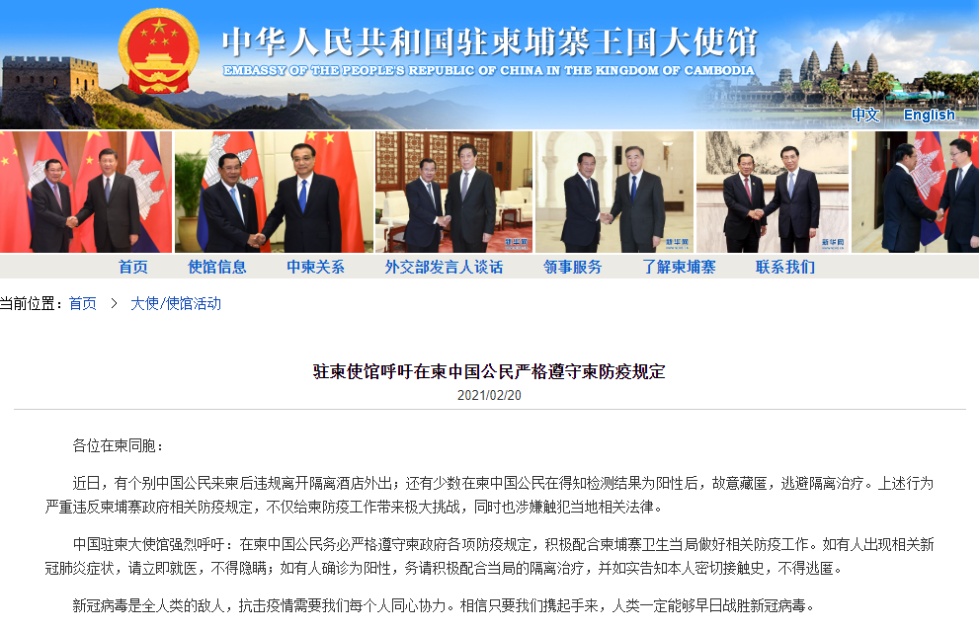 海外网2月20日电 据中国驻柬埔寨使馆网站消息,驻柬使馆呼吁在柬中国公民严格遵守柬防疫规定,全文如下: