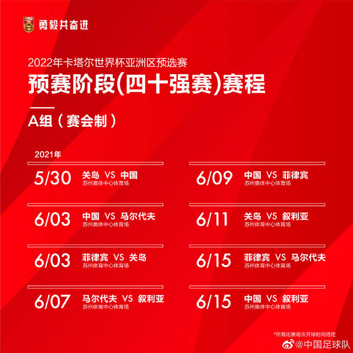 https://news.sznews.com/pic/2021-04/01/e4ce322c-1c98-460b-abb8-1789b29b850a.jpghttps://www.sznews.com/news/content/2021-04/01/content_24097146.htmhttps://www.sznews.com/news/content/mb/2021-04/01/content_24097146.htm中国足球队微博2022年卡塔尔世界杯亚洲区预选赛预赛阶段(四十强赛)剩余比赛日期确定。中国队所在的A组比赛将在苏州举行,中国队将于5月30日率先迎战关岛队。1/enpproperty-->