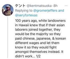 “100年前,夏威夷的白人地主知道,如果亚裔劳工们团结起来,他们将成为多数,所以他们(地主)就给中国人、日本人和韩国人不同的工资并且让他们知道,于是他们自己内部就打起来了。”