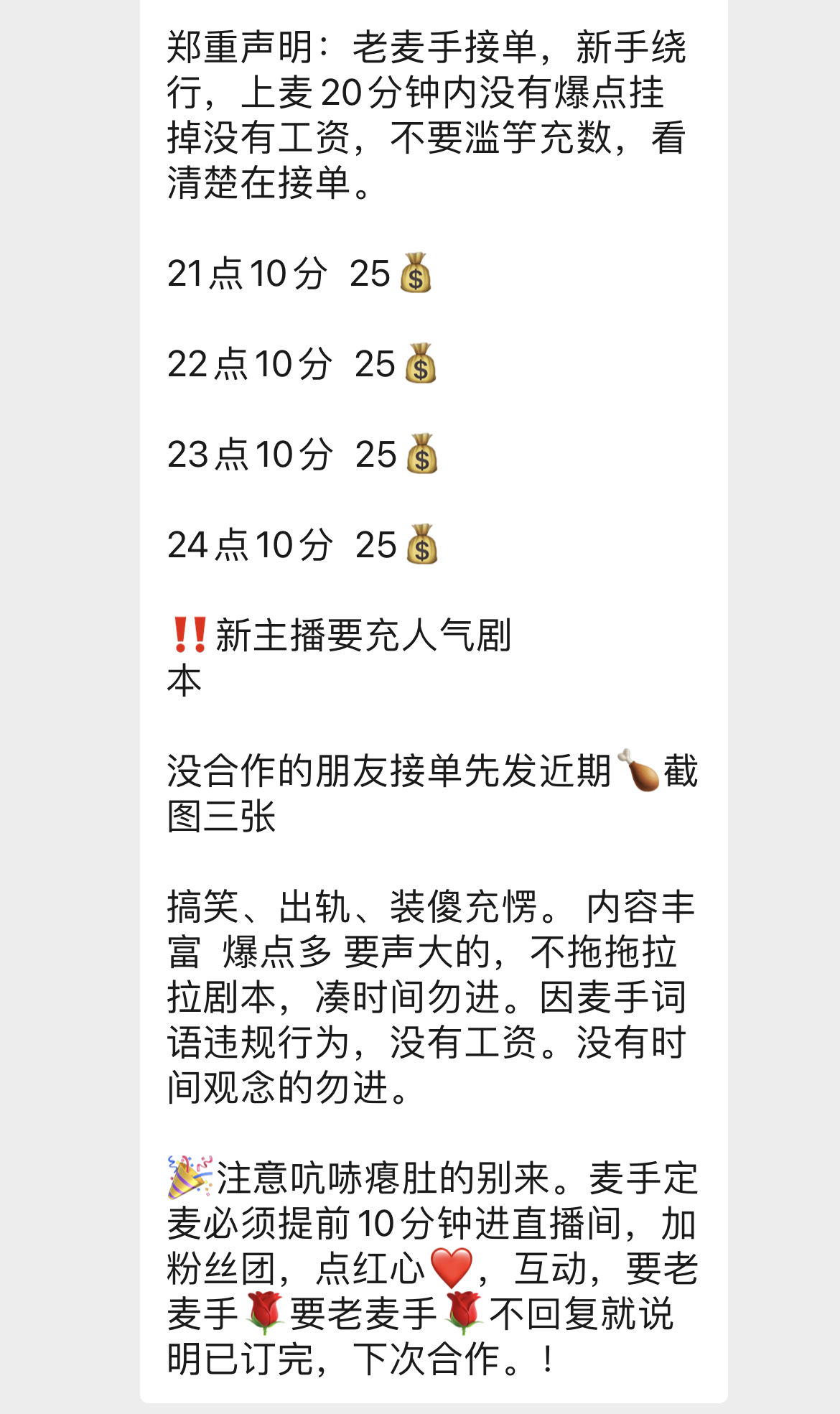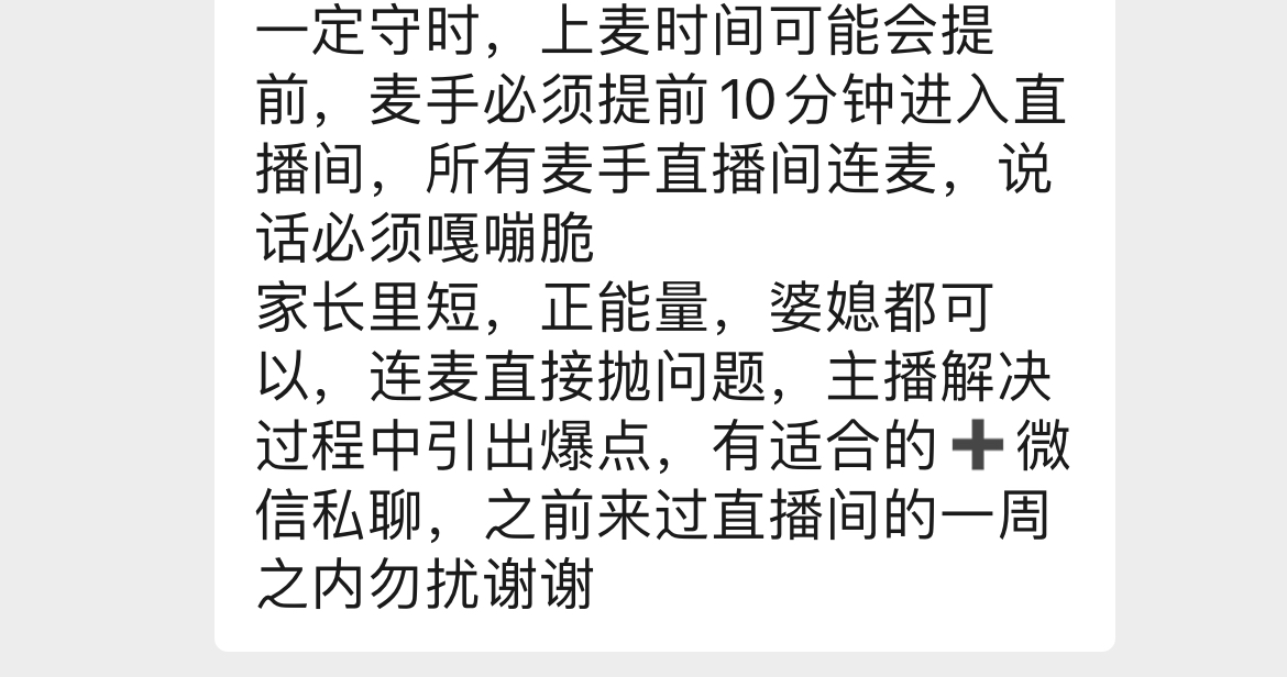 中新网记者发现,网上有不少情感主播与麦手沟通的群,还有供麦手接单的小程序。招麦手的信息一般会说明时间、价格,通常还要求口音、经验、内容等。通常情况下,有丰富经验的老麦手较受欢迎。据上述业内人士介绍,达成初步合作意向后,主播会先审核剧本大纲。直播前,主播还会联系麦手对戏,大概走一遍直播流程,以免出意外。如果是互怼的戏或者是出轨激情的戏,还要商量好尺度,免得影响直播效果或被封号。
