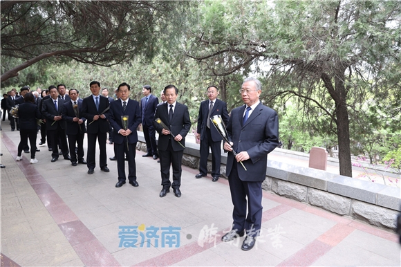刘家义、李干杰缓步上前,仔细整理花篮缎带。随后,省领导拾级而上,来到革命烈士墓前,怀着无比崇敬的心情瞻仰王尽美、邓恩铭等烈士墓,俯身鞠躬并献上手中鲜花,深切缅怀他们的丰功伟绩。