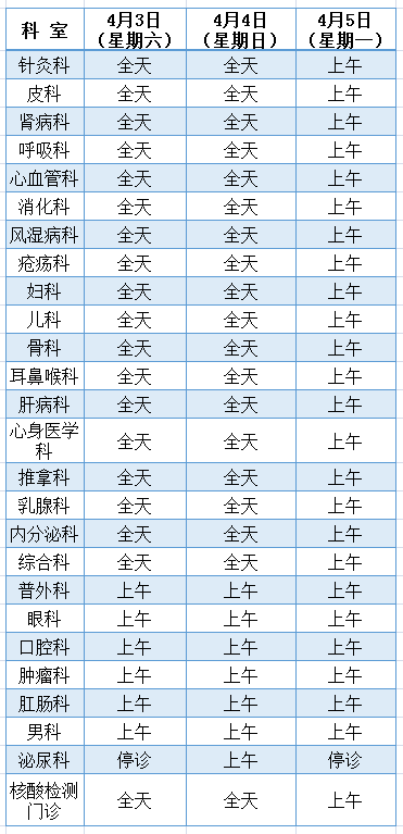 门诊:综合内科、骨科、骨伤科4月3—5日正常门诊。