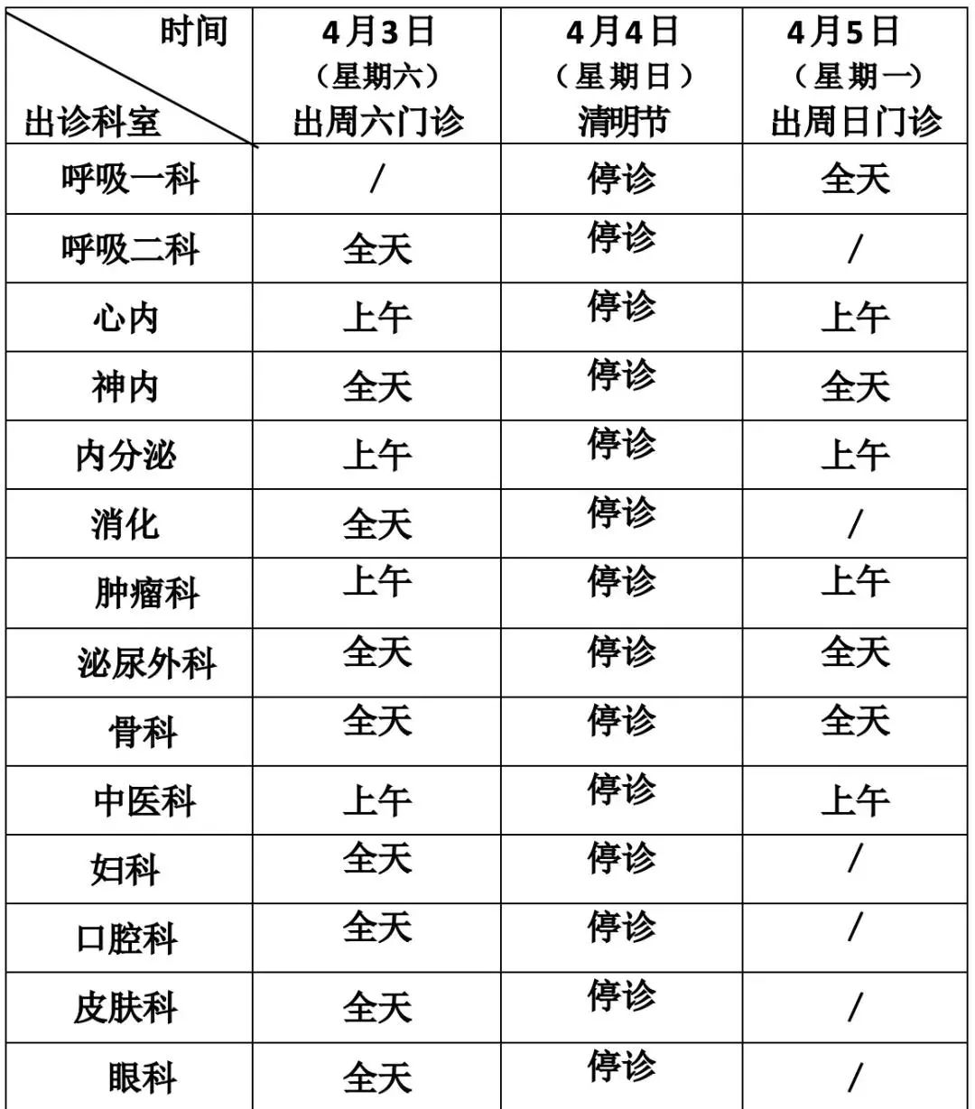 1. 4月4日(周日)清明节当天停门诊,4月3日、5日按周六周日门诊安排。