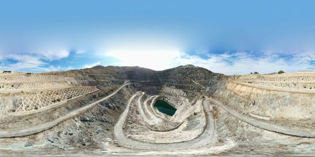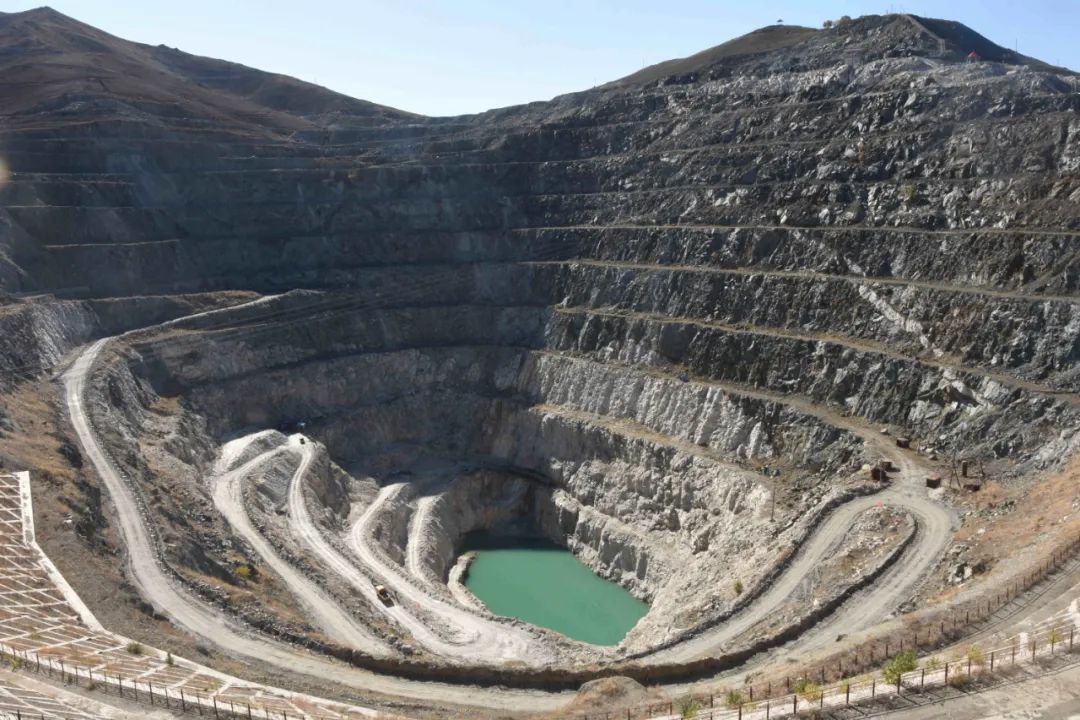 下方是一座纵深数百米的巨型矿坑,沿着坑体边缘环绕着一圈又一圈石子路,沿路又零星分布着一眼眼矿洞,在其中几个矿洞洞口,还有工人施工留下的工具和器械。或许是矿坑已深及储水层,坑底淤积着一汪幽蓝的水,像只明亮的眸子。