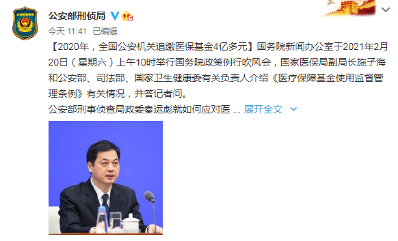据公安部刑侦局微博,国务院新闻办公室于2021年2月20日(星期六)上午10时举行国务院政策例行吹风会,国家医保局副局长施子海和公安部、司法部、国家卫生健康委有关负责人介绍《医疗保障基金使用监督管理条例》有关情况,并答记者问。