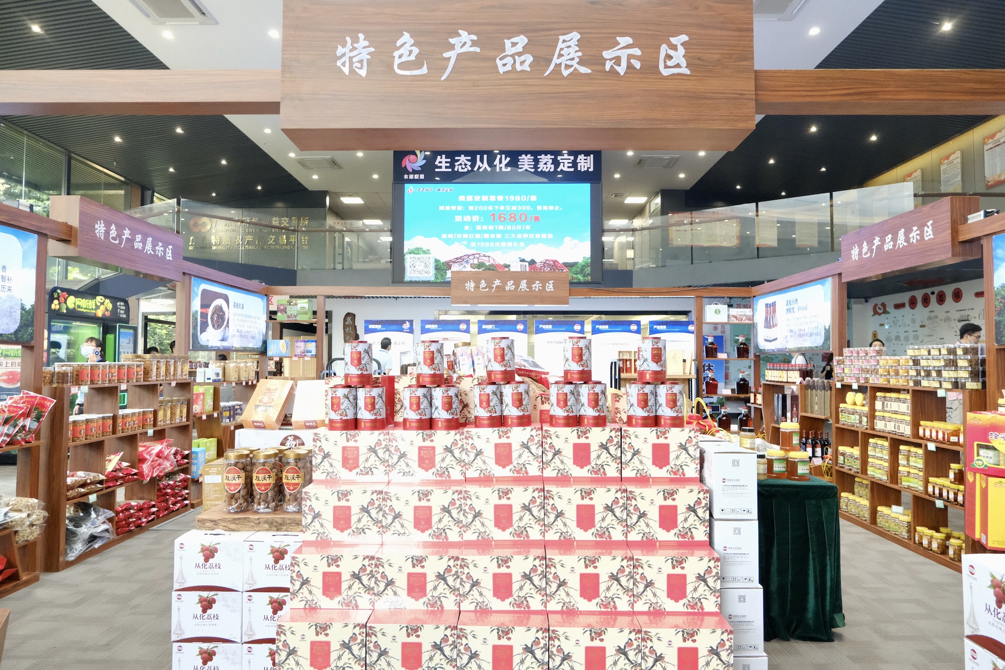 ▲荔博园内的特色产品展示区摆放了荔枝干、荔枝酒、荔枝蜜等各种荔枝加工产品
