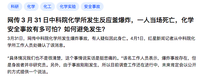 据知乎上一则话题,2021年3月31日,中国科学院化学研究所发生实验室安全事故,一人死亡,事故的具体原因仍在调查中。