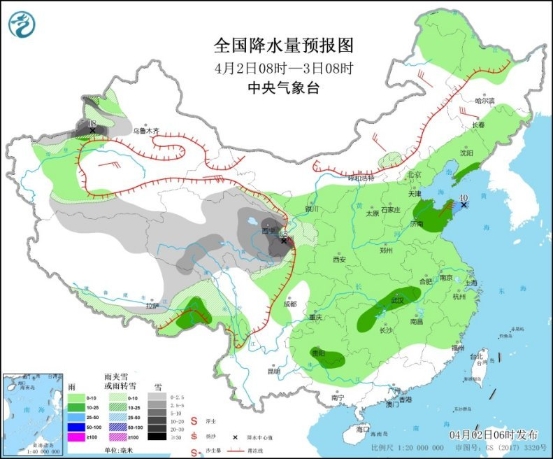 预计,今明两天(4月2日至3日),全国大部降水频繁,其中今天,西北部分地区将出现较强降雪。此外,受频繁冷空气影响,全国大部将陆续迎来明显降温,部分地区累积降温幅度超10℃,多地气温将会降至较常年同期偏低的水平。