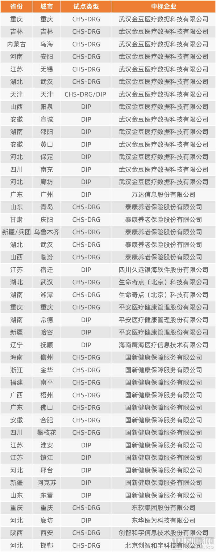 首先要说明的是,试点DRG/DIP系统主要分为医保局端(局端)和医院端(院端)。从信息收集的实际出发,我们选择了局端作为统计对象。我们对各地医保局DRG/DIP系统截至2021年3月的中标公开信息进行了梳理,包括但不限于政府采购网站、各地政府及医保局官网、各企业公开财报、官宣信息以及可以侧面反映中标情况的新闻报告等公开信息。