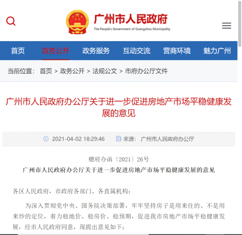 4月2日,广州市政府办公厅印发了《关于进一步促进房地产市场平稳健康发展的意见》(以下简称《意见》),从地价、楼价与监管等方面做出明确规定。据悉,广州将加强对新建商品住房价格指导,指导开发企业合理定价。对通过享受人才政策购买的住房(含新建商品住房和二手住房),限售年限从取得不动产证之日起满2年延长到满3年。《意见》自2021年4月3日起执行。