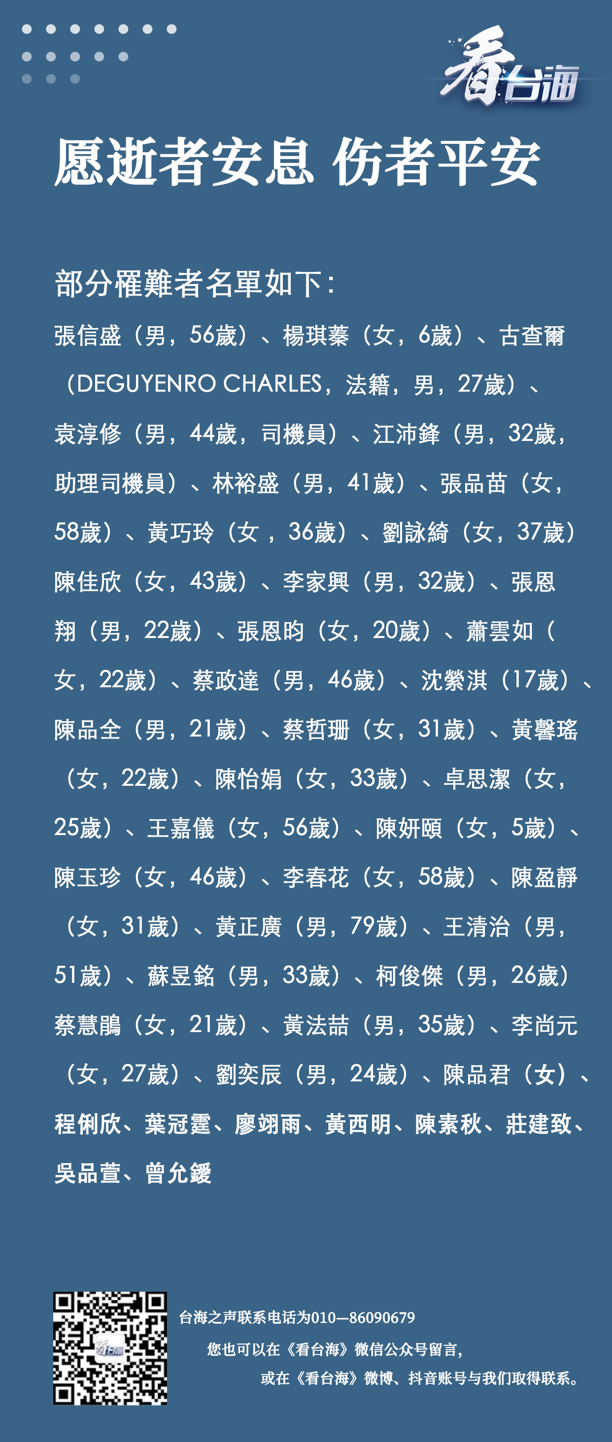 4月2日台铁“太鲁阁号”408次列车出轨事故部分罹难者名单如下。
