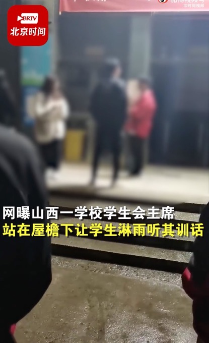 4月1日,山西运城。网曝山西一学校学生会主席站在屋檐下让学生淋雨听其训话,视频中,一个学生被罚做俯卧撑,其他学生议论,遭训话者辱骂。有网友表示,好大的官威,怒斥这是官僚主义作风。2日,校方表示,训话者并非学生会主席,是学生会干部。目前,校方已对其进行批评教育,并责令其作出检查。