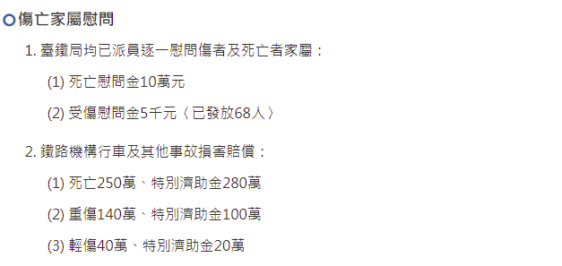另外 ,根据台湾铁路机构行车及其他事故损害赔偿,死亡赔偿金为250万元新台币、特别济助金为280万元新台币;重伤者赔偿140万元新台币、特别济助金为100万元新台币;轻伤赔偿40万元新台币、特别济助金为20万元新台币。