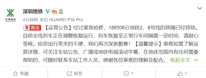 见圳客户端•深圳新闻网2021年4月3日讯(深圳特区报记者王小虎)记者获悉,深圳地铁官方微博发布消息称:经过紧急抢修,18时06分地铁2、8号线的故障已经排除。目前全线列车正在调整恢复运行,列车恢复至正常行车间隔需一定时间,请耐心等候。给您出行带来的不便,我们再次深表歉意!