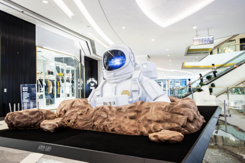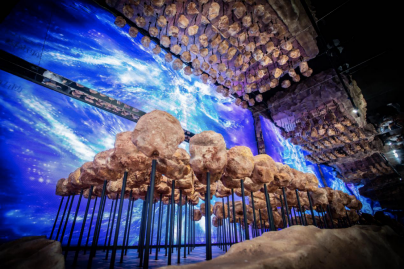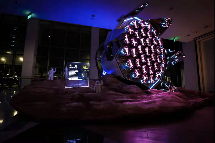 此次展览,共分为“启航”“探索者”“太空舱”“星际浮沉”“星际走廊”五大展示空间。“启航”由36朵镜面万花筒围合而成的发射器引擎装置。“探索者”内部采用全息风扇播放星空画面,与场景效果完美融合。“太空舱”并非是传统意义上的装着无数精密机械设备的太空舱,而是装载着宇宙中各种神秘物质的奇特空间。“星云浮沉”展示的是形态各异的陨石组成的陨石群。观众踏入“机械星联·星际走廊”会发现脚下是无垠宇宙星河漫漫,脚边的陨石星体正在进行规律地自转,七根高约2米的能量柱灯营造出源源不断输送能量的视觉效果,更具科技未来感。