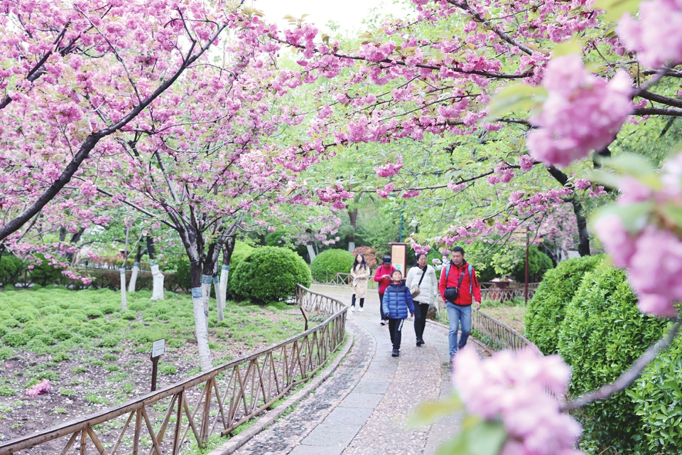 记者在济南植物园看到,园内榆叶梅、美人梅、郁金香、碧桃、海棠、樱花等正次第开放。儿童乐园内的秋千、吊床、跷跷板、摇椅等设施俱全,让游客陪伴家人在回归自然的同时享受亲情时光。