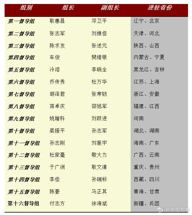 长安街知事注意到,16位组长中,有的带队经验丰富,比如第一组组长、国安部原部长耿惠昌,曾在不忘初心 牢记使命”主题教育中担任中央第十六指导组组长,也曾在中央生态环保督察中担任组长。