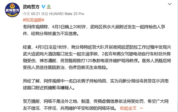 @武鸣警方发布通报,有网传视频称,4月3日晚上20时许,武鸣区供水大厦附近发生一起持枪伤人事件,经我分局核查为不实信息。