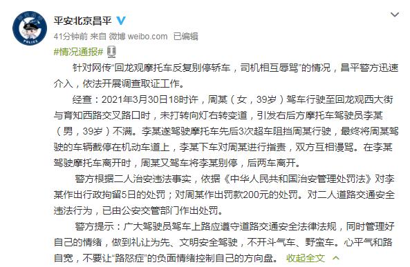 中新网4月4日电 据北京市公安局昌平分局官方微博消息,针对网传“回龙观摩托车反复别停轿车,司机相互辱骂”的情况,昌平警方迅速介入,依法开展调查取证工作。警方根据治安违法事实,对摩托车驾驶员李某作出行政拘留5日的处罚。