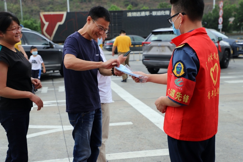 在交投集团党委部署下,各公司党组织积极发挥“党员突击队”“青年服务队”的核心力量,党员先锋下沉一线保畅通,团委组织青年志愿者到各服务区开展一系列“党旗红我为群众办实事”志愿服务活动,把办实事落到实处。在大广高速从化服务区、新丰服务区,北环高速广氮服务区,广台高速金山服务区以及机场高速收费站出口等地方,各路段设立“党员先锋站”和“志愿服务点”,执勤党员佩戴党徽及“大道先锋”袖章上岗,率领青年团员和志愿者热心为司乘提供防疫及垃圾分类知识宣讲、出行路线指引、秩序维护、测温、消毒等便民服务,清洁服务区卫生,免费发放应急口罩、消毒液、矿泉水、纸巾等。