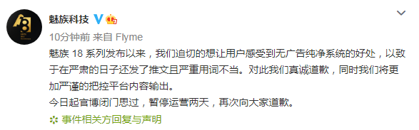 今日午后,魅族科技道歉称,魅族18系列发布以来,迫切的想让用户感受到无广告纯净系统的好处,以致于在严肃的日子还发了推文且严重用词不当。对此我们真诚道歉,同时我们将更加严谨的把控平台内容输出。今日起官博闭门思过,暂停运营两天,再次向大家道歉。