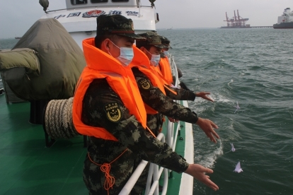 在广州湾海域,担负战备值班任务的舰艇同步开展纪念活动。舰艇汽笛哀婉而深沉,响彻海空,执法员在舰艇上庄严肃立,面向大海,深情默哀,手叠千纸鹤撒向大海,带着深沉的哀思,随着船艇的浪迹远远地漂向大海深处,向伟大祖国的忠诚卫士们致哀,致敬!