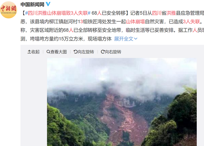 记者5日从四川省洪雅县应急管理局获悉,该县境内柳江镇赵河村13组铁匠湾处发生一起山体崩塌自然灾害,已造成3人失联。